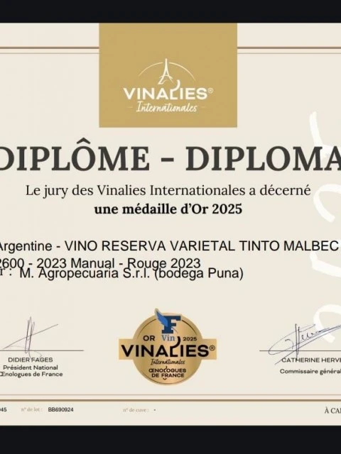 Como si fuera poco, Bodega Puna también participó en Vinalies Internationales, el prestigioso concurso francés avalado por la OIV, que en su 30° edición se celebró en Cannes. Allí, más de 120 enólogos de 40 nacionalidades cataron cientos de muestras a lo largo de cinco jornadas. El resultado fue contundente: dos Medallas de Oro para Puna, una por el Malbec Reserva 2023 y otra por el Gran Reserva 2021.