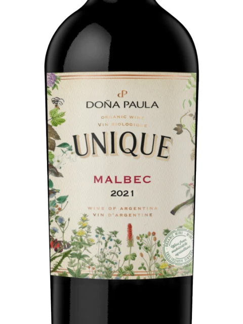 Unique, primer vino orgánico y vegano de Bodega Doña Paula, presenta aromas intensos de frutas rojas y notas herbales que recuerdan a la menta y hiervas silvestres, con un fondo especiado. En boca es un vino de cuerpo medio, taninos de textura fina y equilibrada acidez.