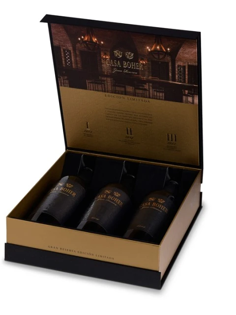 Estuche partida limitada con las primeras tres cosechas de Casa Boher Gran Reserva Buenos Aires, noviembre de 2021.- Según …