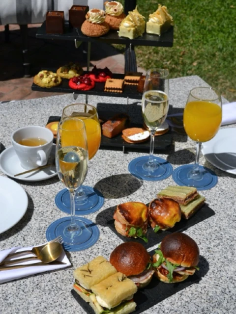Todas las variedades dulces y saladas son acompañadas de dos Infusiones calientes, un agua mineral o jugo de naranja por persona y para brindar, una copa de espumante Chandon Extra Brut.