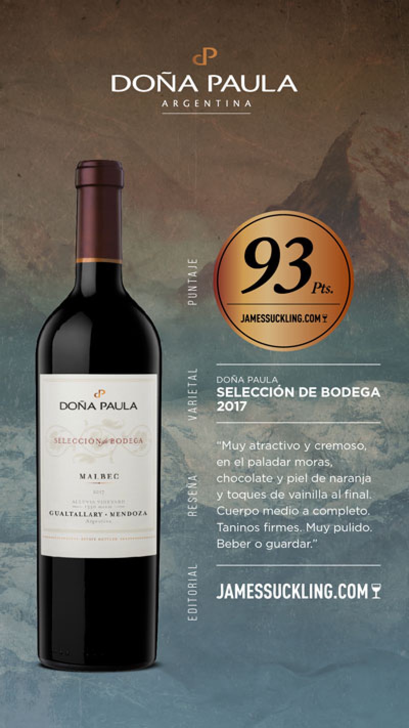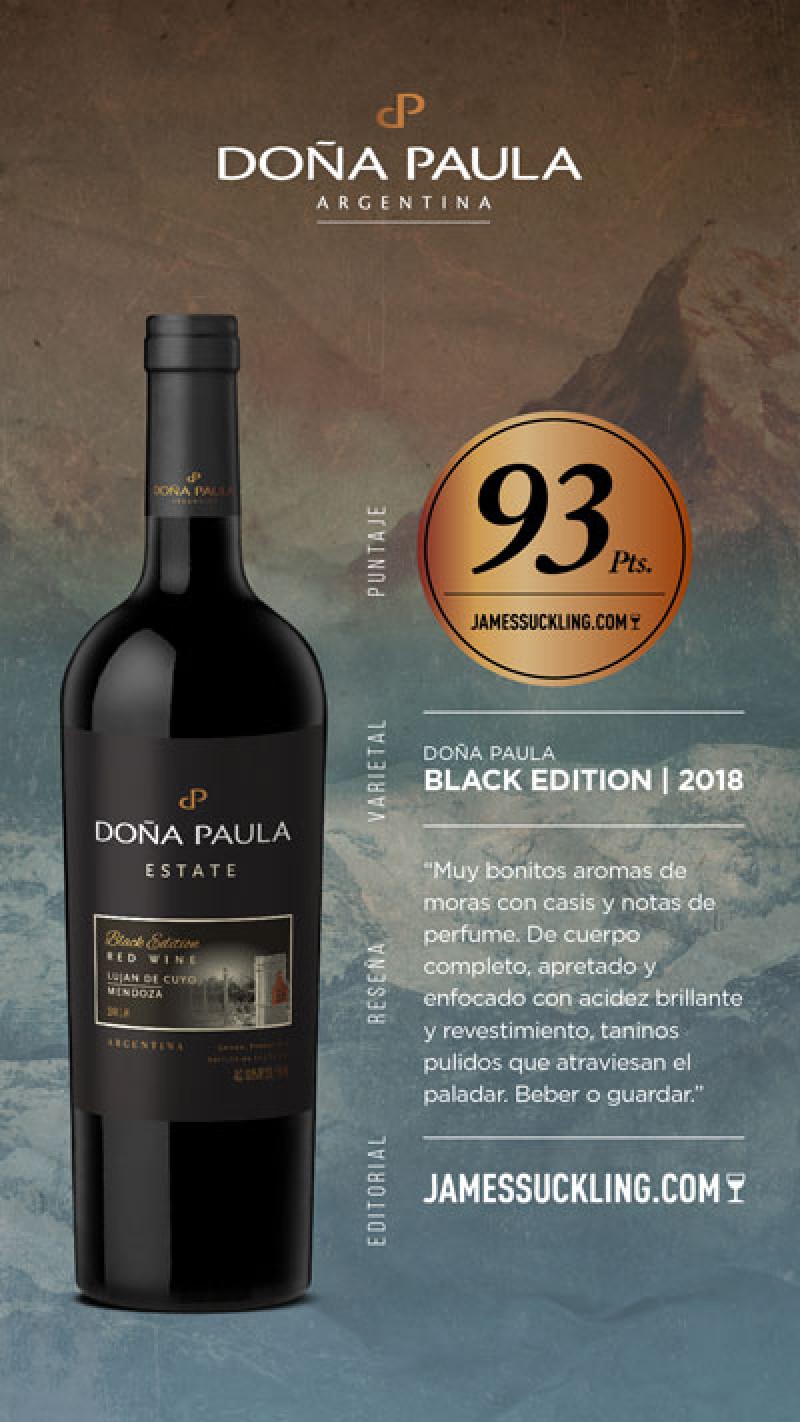 Doña Paula Estate Black Edition 2018, 93 puntos: Se trata de un assemblage de Malbec y Cabernet Sauvignon con un toque de Petit Verdot, esta etiqueta provenie de viñedos ubicados en Finca El Alto, Luján de Cuyo. De este vino, Suckling destaca sus aromas a moras en casis y notas de perfume, de cuerpo medio a completo, apretado, enfocado con acidez brillante y revestimiento, con taninos pulidos que atraen el paladar. Beber y guardar.