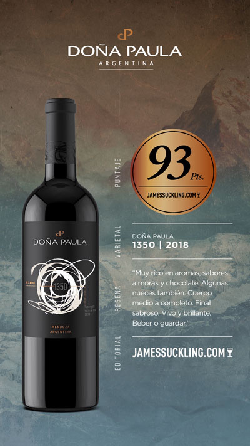 Doña Paula 1350 cosecha 2018, 93 puntos: los viñedos están ubicados en Gualtallary, Tupungato, Valle de Uco. Se trata de un blend elaborado a partir de Cabernet Franc, Malbec y Casavecchia. Según comentó Suckling en su reporte, “se trata de un blend con ricos aromas a moras y chocolates. De cuerpo medio a completo. Con final sabroso, vivo y brillante. Beber o guardar».