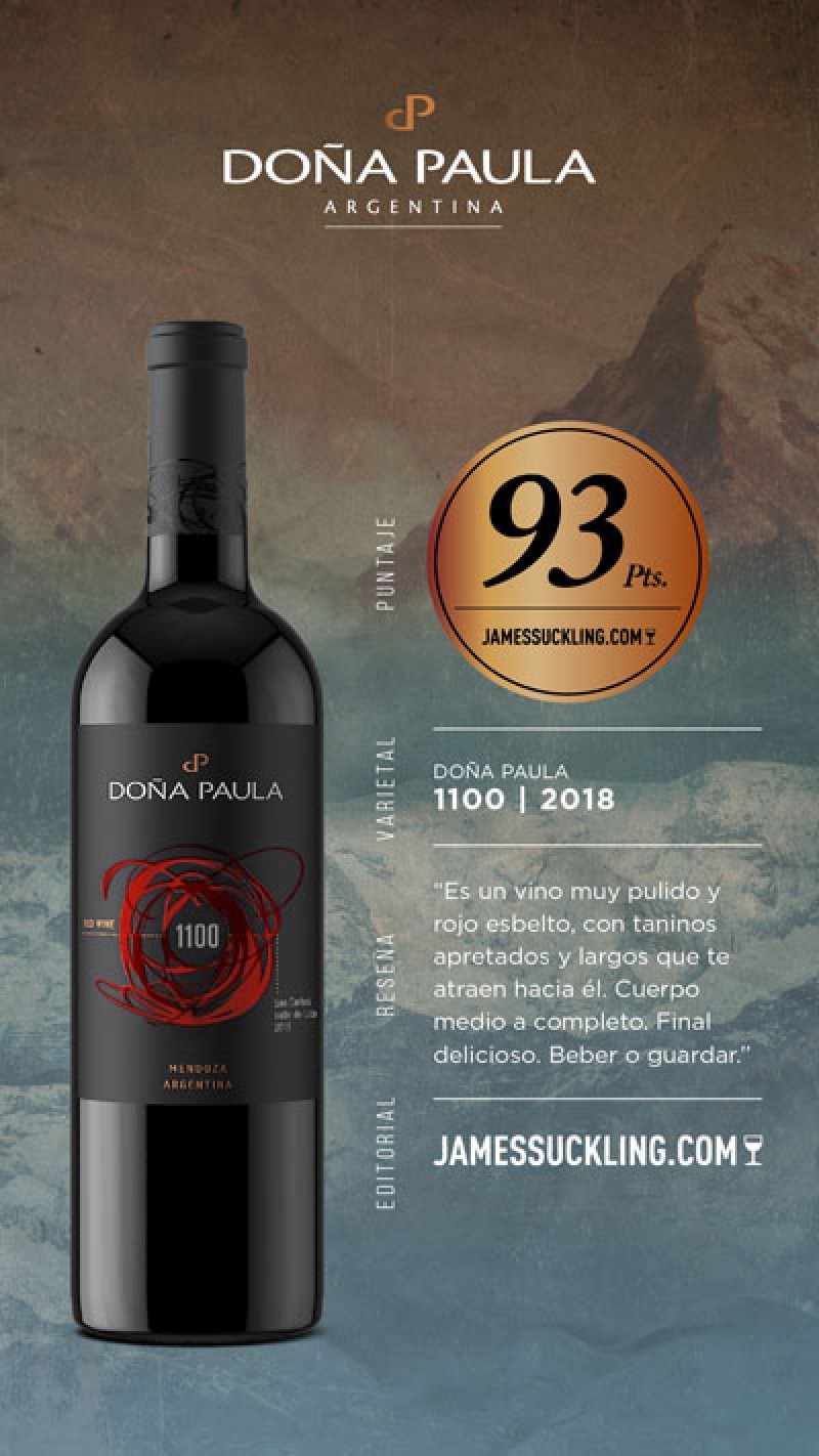 Doña Paula 1100 cosecha 2018, 93 puntos: proviene de la zona de El Cepillo, San Carlos, Valle de Uco. Es un corte de Malbec, Syrah y Cabernet Sauvignon. El especialista destacó de este vino “su tono pálido y color rojo esbelto, taninos apretados y largos. Con cuerpo medio a completo y un final en boca delicioso. Beber o guardar .