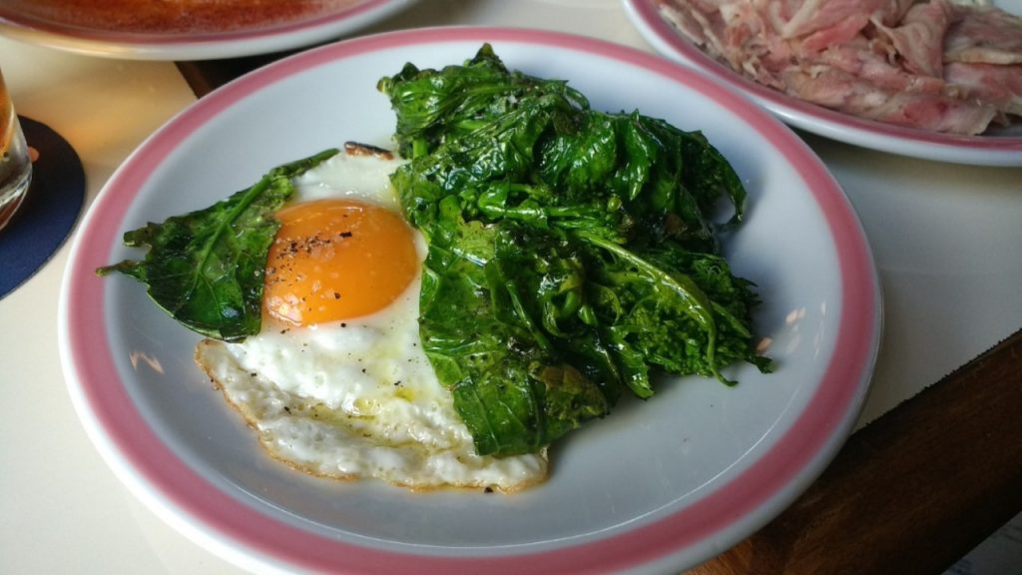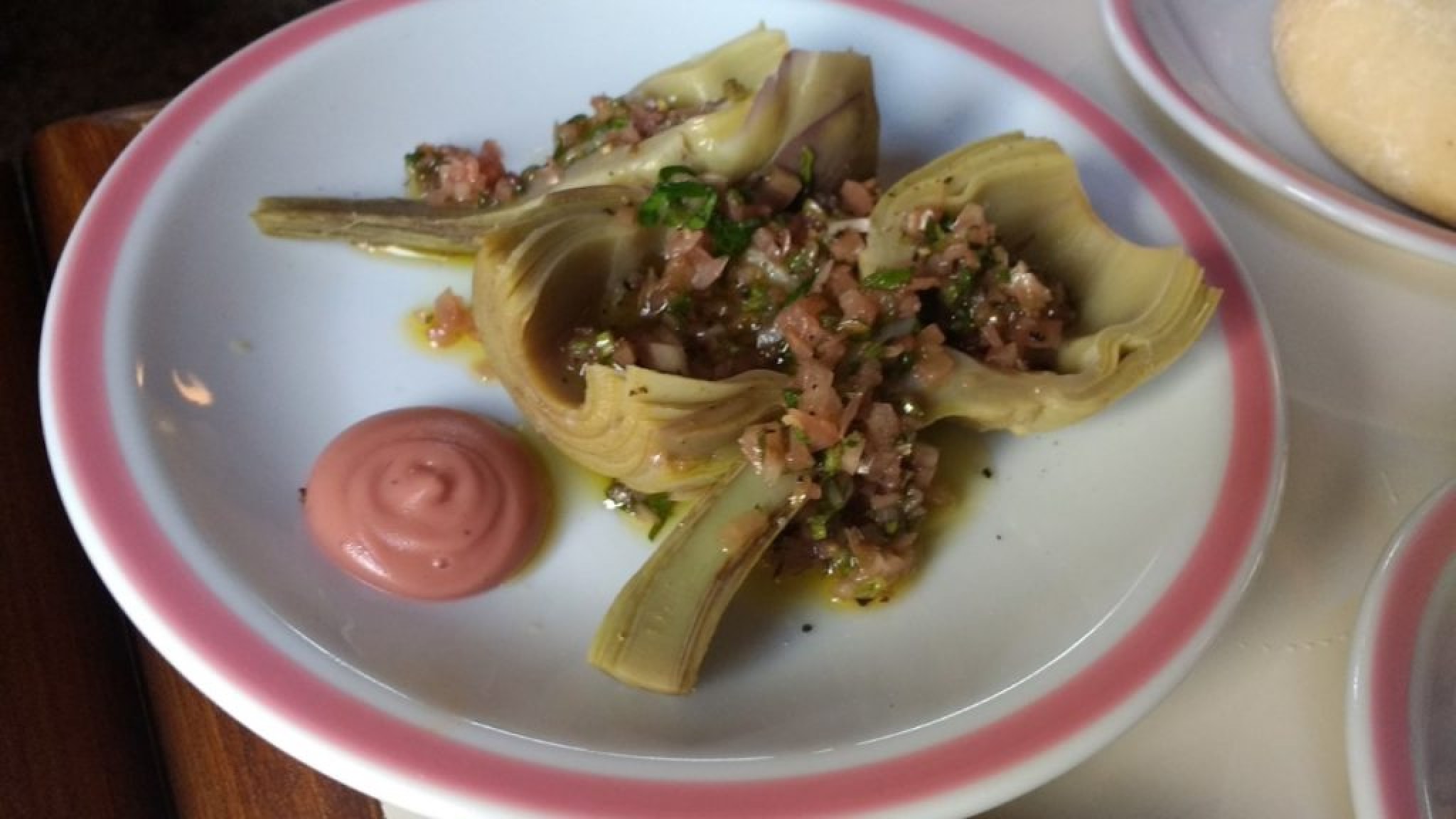 huevo frito ($150), Alcauciles de la Plata con vinagreta