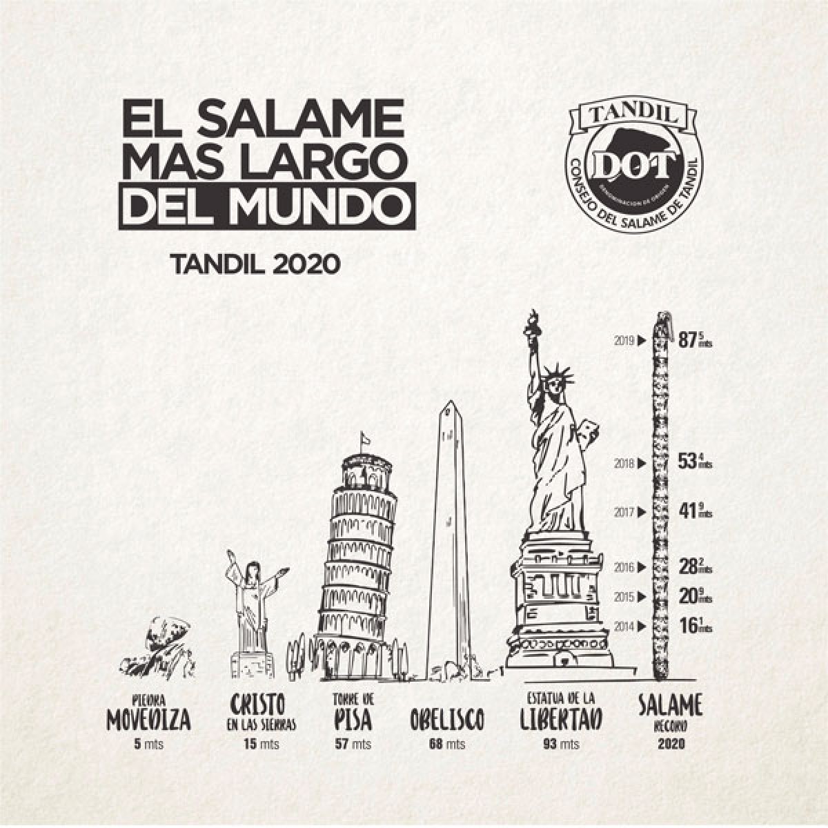 Luego de haber obtenido el récord mundial en 2019 con 87.56 metros de longitud y 262 kilogramos de peso, el Consejo de Denominación de Origen Salame de Tandil presentará, en el marco de la XXXVII Edición del Festival de la Sierra, un salame curado que intentará superar el resultado anterior y acercarse a la icónica Estatua de la Libertad, cuya altura alcanza los 93 metros.