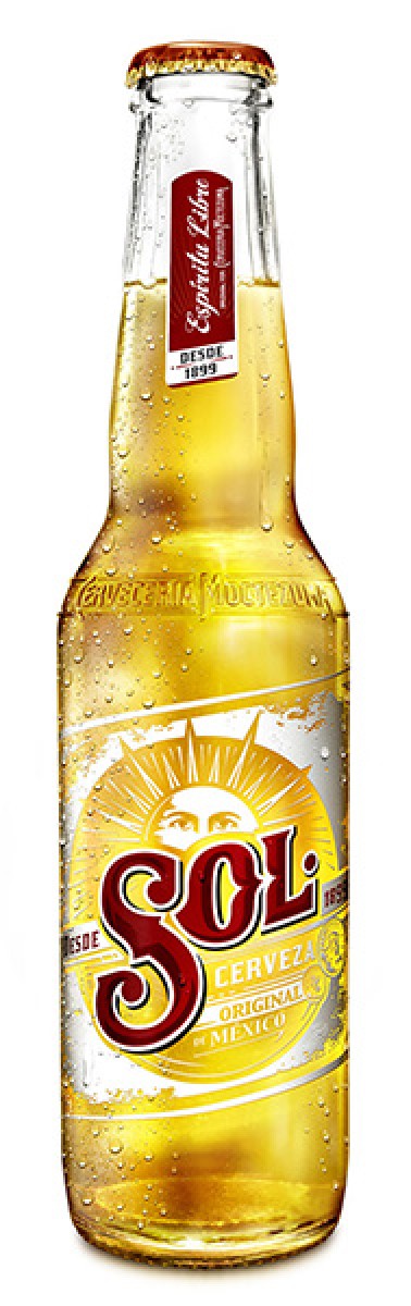 Sol se presenta en una botella transparente de diseño áspero poco convencional, rompiendo los códigos de las cervezas tradicionales, y posee una etiqueta inspirada en el sello del naciente Sol Mexicano. Cuenta una leyenda que un maestro cervecero se encontraba en 1899, en una pequeña fábrica de cerveza llamada «El Salto del Agua», en el Distrito Federal, y observó un rayo de sol cayendo sobre la olla de elaboración. El fenómeno llamó fuertemente su atención, y en honor a esa experiencia, bautizó a su nueva cerveza como «Sol», palabra que reunía la experiencia vivida y el simbolismo del “sol en el horizonte como un viaje hacia la libertad.
